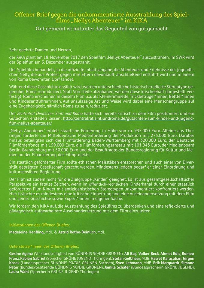 Am Samstag, den 18.11.2017, will der KIKA trotz vielfältiger Kritik den Film "Nellys Abenteuer" ausstrahlen. Madeleine Henfling und Astrid Rothe-Beilich haben dazu vor einigen Wochen einen offenen Brief geschrieben, der etwas weiter unten zum Download bereit steht.